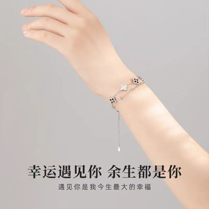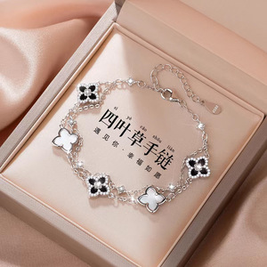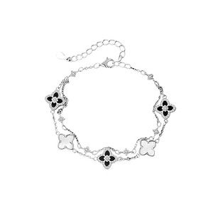 小さな四つ葉のクローバーブレスレット、女性用、軽い高級感、個性的なデザイン、黒瑪瑙と白螺貝の二重ブレスレット、彼女へのプレゼントに