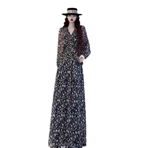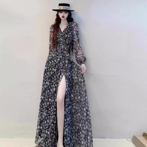 高級感プラスのロング丈の背と足首のフランス風の気質vネックのワンピースの長袖は腰を収めてスリットの長いスカートの仙を開きます。