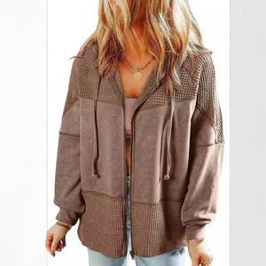 欧米の個性の色合わせの帽子のジャケットの女性の秋の新型の復古的な水洗いのワッフルの格は縄の長袖の上着の女性を引き出します。