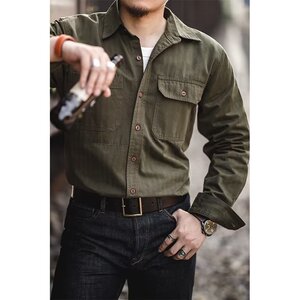 アメリカンレトロヘビーウェイトヘリンボーン柄ワークシャツメンズエンジニア風和風アミカジ風ラペル長袖シャツメンズ