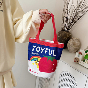 新しいイラストバケツのキャンバスを手に入れて、外に持ち出して、プリントのハンドバッグを持っています。