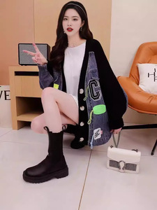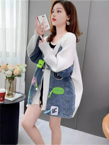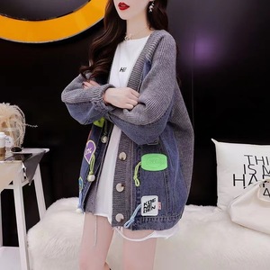 韓国風デニム切り替えセーターコート レディース 2025秋冬新作 デザイン性抜群 ニッチ ゆったり カーディガン ニットトップス