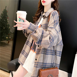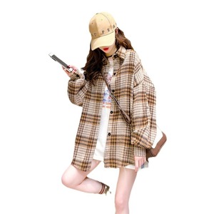 毛の格子のシャツの女性のレトロな港の味は外で百合の長袖の上着を着ます。