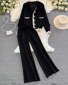 ファッションスーツ女性韓国版衝突色長袖vネック単列ボタンニットカーディガン2点セット