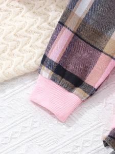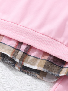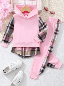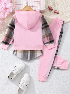 国境を越えた新しい女性の子供の長袖の帽子の格子はガードルのズボンのスーツをつなぎ合わせます。