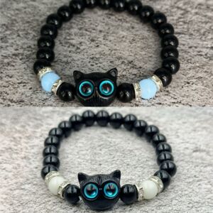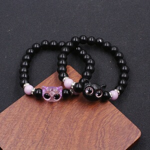 BNS-0437-パープル夜光黒透明紫猫ペアブレスレット