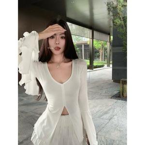 アメリカのギャルvネックのラッパの袖のtシャツの女性の秋の修身はやせているデザイン感が現れます。