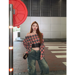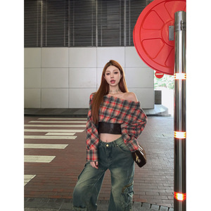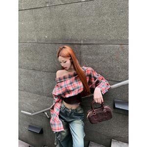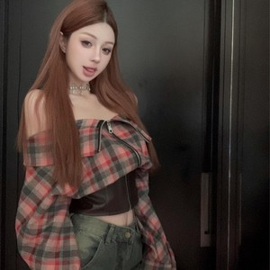 ファッションギャル風一字肩に上着を着た秋の新しいデザイン感のある小衆は皮質長袖シャツの女性をつなぎ合わせた