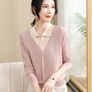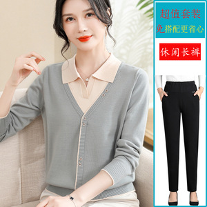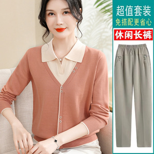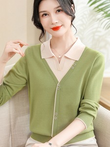 お母さんの秋の服の洋風の偽の上着のニットの底のシャツの中で年配の女性の春秋は長袖のプルオーバーのセーターをめくります。