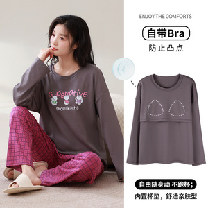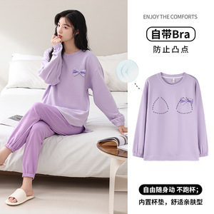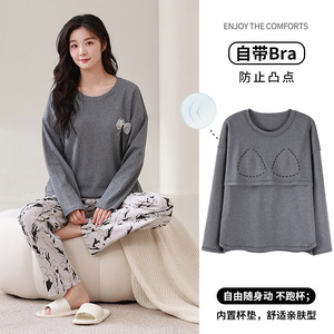 胸パッド付きパジャマ女性春秋冬純綿長袖ゆったりカバー