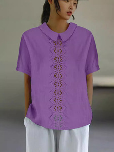 綿麻の網のレースの独立した駅の新型のゆったりした襟のシャツの女性の半袖の上着のtシャツをつなぎ合わせます。