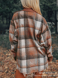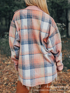 欧美休闲宽松上衣格纹拼接灯芯绒撞色纽扣口袋长袖外套
