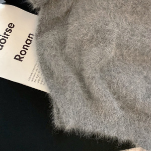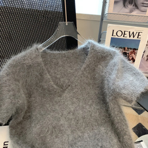 グレーvネック馬海毛半袖ミンクセーター女性秋冬レトロ気質ニット上