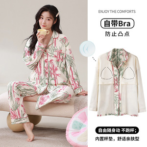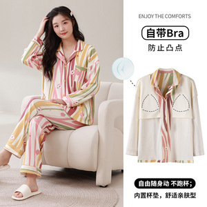 胸パッド付きの純綿パジャマ女性春と秋の長袖カーディガンの前に綿の大きいサイズの家庭服セット秋冬