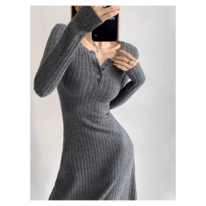飒姐气场!感坑条针织毛衣裙女春秋季慵懒风收腰中长款连衣裙