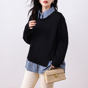 実際に微太った大きいサイズの婦人服のカジュアルpolo襟の偽の2つの衛衣の女性の春秋のゆったりしているストライプは上着をつなぎ合わせます。
