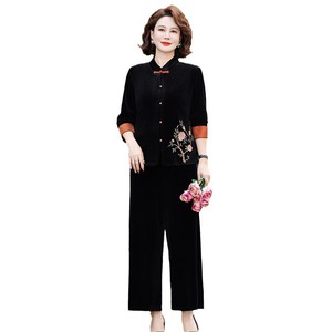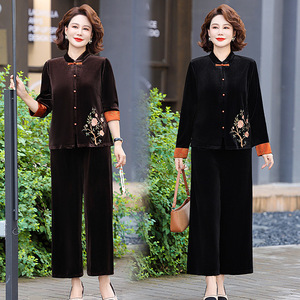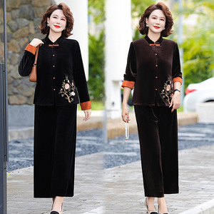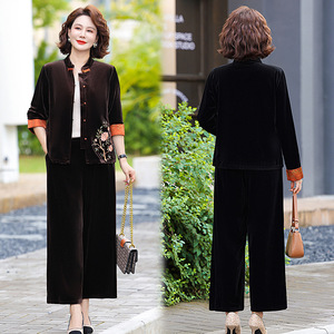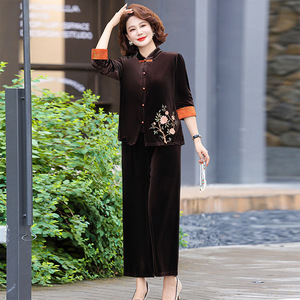 お母さんの秋の服のスーツの金のベルベットの中国式の刺繍のコートの新型の洋気の中で年配の女性の春秋の上着の2つのセット