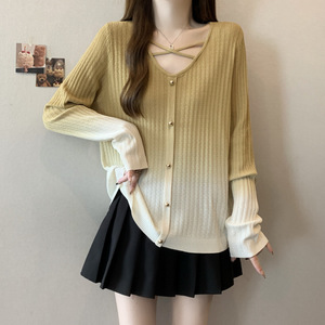 太ったMMの大きいサイズのピットのUの襟のグラデーションの長袖の気質の年齢を減らすニットの上着の甘い年齢を減らします。