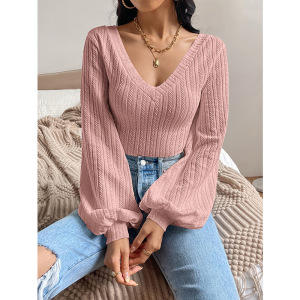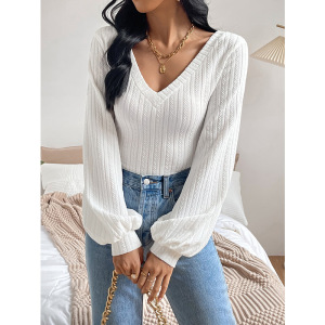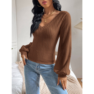 欧米の新型vネックの泡の袖のシャツのアマゾンの対外貿易の修身の気質の通勤の麻の花のニットの長袖の上着