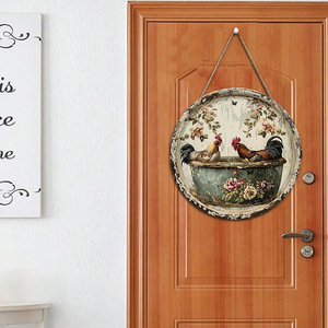 現物のレトロな壁面に田舎の花園の装飾品を飾って古い鉢の中の鶏の図案の木製の円形の標識を作ります。
