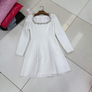 十三行优雅轻熟财阀千金时髦小个子钻方领长袖连衣裙收腰A2#8669