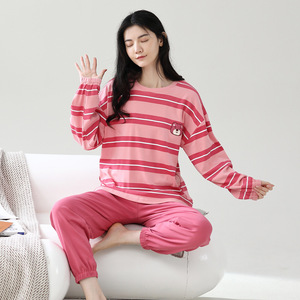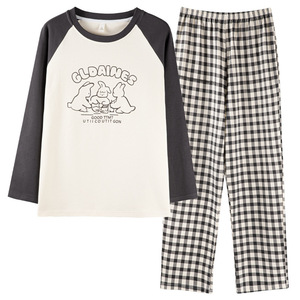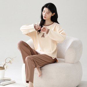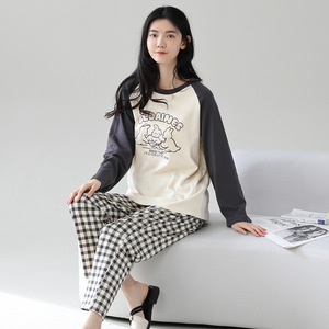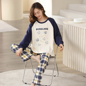 青年女性の純綿パジャマ長袖丸首カバーのゆったりとした快適なカジュアル女性家庭服セット秋の卸売り