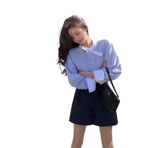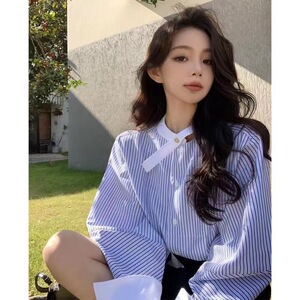 女性用秋の新作、フランス風高級感漂う美しいブラウス、ブルーストライプの女性用トップス、デザイン性の高い個性的なシャツ