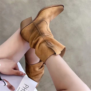 蝶マカオ牛革の色拭き先の太さと2024秋の預金西部カウボーイブーツのしわの積み重ねブーツの中筒ショートブーツ
