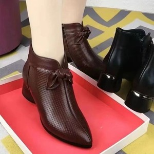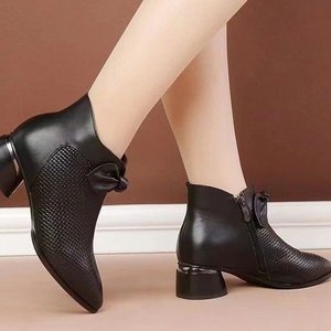 软皮民族风皮靴女2025秋冬新款尖头粗跟短靴舒适百搭妈妈鞋马丁靴