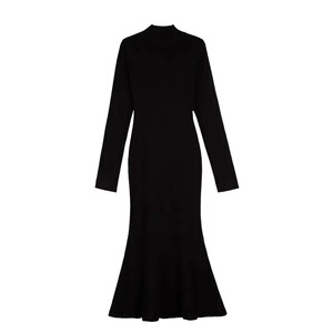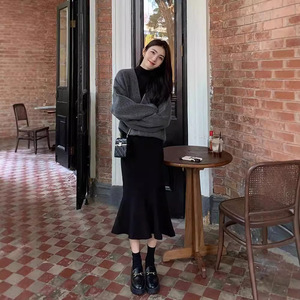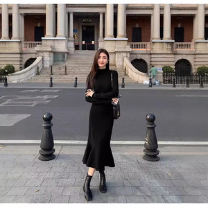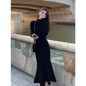 【ニットスカート】ヘボン風の黒い中に底のニットワンピースとコートを着て、長いセーターの魚の尾を修理します。
