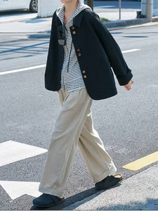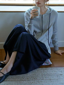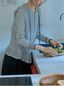 「オプリーナ」秋の新商品のストライプのパーカーと帽子のファスナーのフリルの縁のニットのカーディガン
