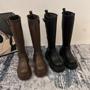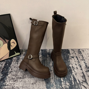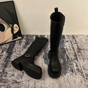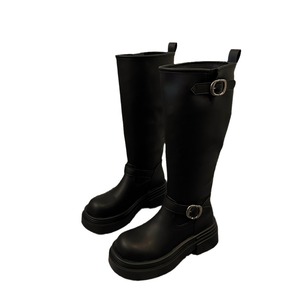 厚底黒ロングブーツ レディース 2025秋新作 レトロ風 小柄さん向け 背が高くなる 膝丈以下 細身ブーツ