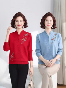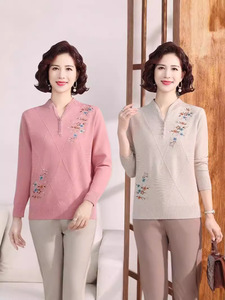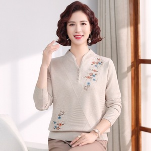 お母さんの秋の新型の洋風のゆったりしているニットの中高年の女性のセーターの春秋服のファッションの刺繍の国風の上着