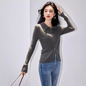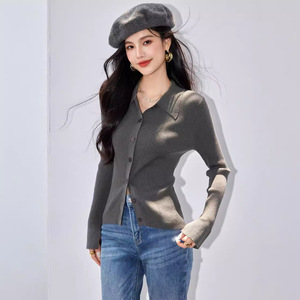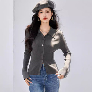 フランスのpolo襟のニットの女性の2024秋のタイプの小さい子供の修身はやせている長袖の灰色のカーディガンの中でセーターを掛けます。