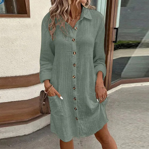 ヨーロッパとアメリカの国境を越えたアマゾン婦人服2025無地コットンとリネンのボタン付きミッドレングス長袖シャツドレスカジュアルドレス
