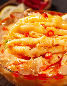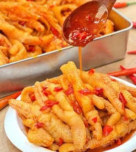 骨のない鶏の爪のクエン酸の辛いニンニクの香りのネットの赤いネットは骨を離れてピーマンの鳳爪を浸します。