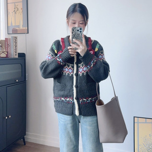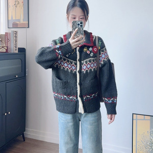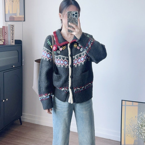 フランスのレトロな子供の襟のフェルト島の立体の花のセーターの女性の秋冬の新型のゆるいニットのカーディガンのコート
