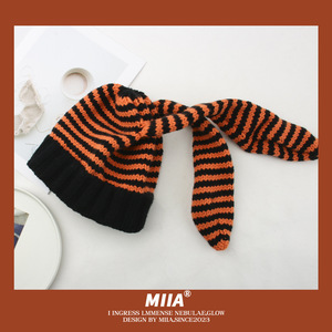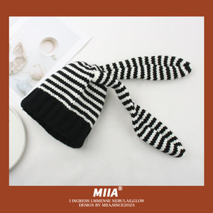 日韓y2kストライプニットキャップかわいいウサギ耳毛糸キャップ保温耳保護キャップ買い物凹形スタイル