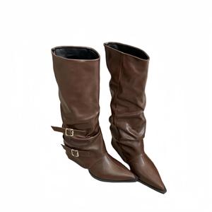 尖头搭扣褶皱堆堆靴2025秋冬朋克风骑士靴中跟炸街辣妹高筒裤筒靴