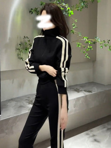 休闲运动套装女秋季新款小个子条纹时尚显瘦短款上衣阔腿裤两件套