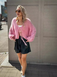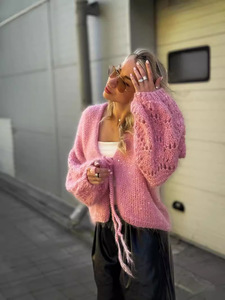 欧米のクロスボーダー速売が爆発した透かし彫りの長袖のニットのカーディガンのセーターの女性の秋冬の新型のvネックの上着