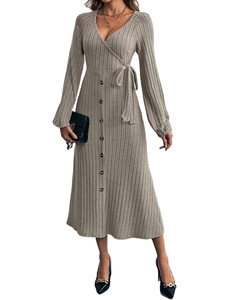 アマゾン2025秋冬新作 欧米風ミディ丈ワンピース クロスボーダー Vネック 無地 ボタン付き レースアップ Aライン ニットワンピース