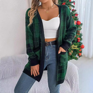 秋冬カジュアル衝突色格子ポケット長袖カーディガンセーターコートクリスマスアマゾンクロスボーダー婦人服