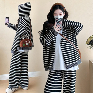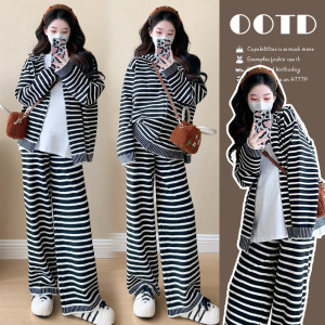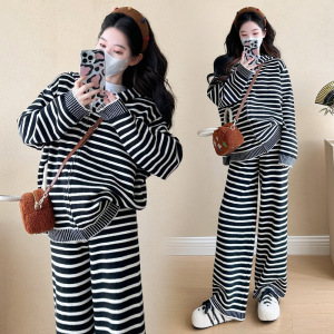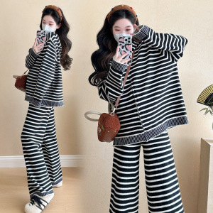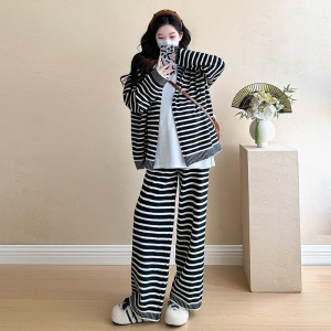 実写スポット ~ 秋冬セット韓国風ファッションカジュアルストライプ厚手セーターコートワイドパンツ2点セット