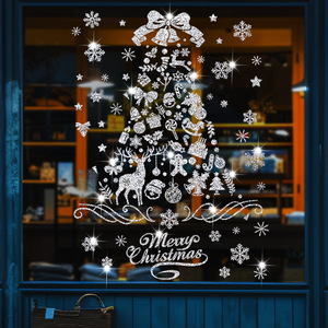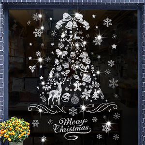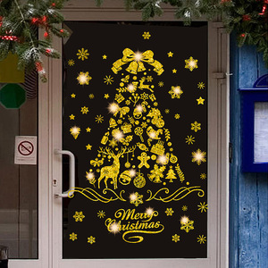 クリスマス装飾シール粉をまいて金色のクリスマスツリーを飾って静電気ガラスの窓を描いて雪の扉を貼って貼ります。