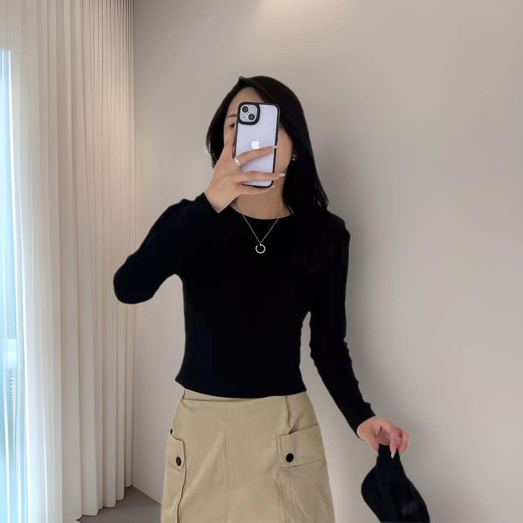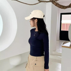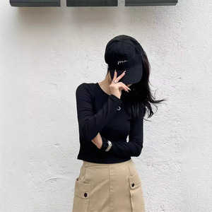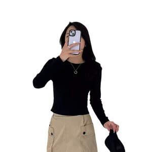 黒の肩の長袖tシャツの女性2024秋冬は白い純綿の基礎金の中にシャツの上着のtシャツを着ます。