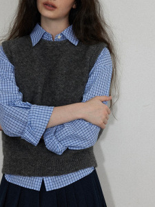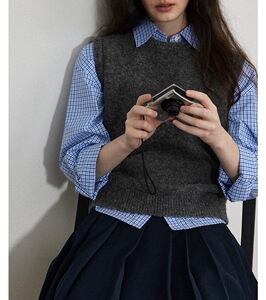 「重ね着のお手本」の怠惰な丸首ニットのベスト女性は秋に柔らかいモチのベストを重ねて着ます。