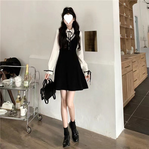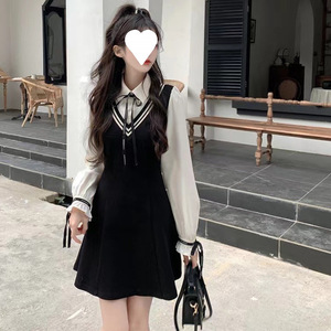 2024秋の学院風の長袖のワンピースは色の偽の2つの明らかなやせている年齢のpoloの襟のa字のスカートの女性にぶつかります。