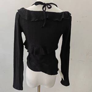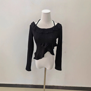 張元英スターと同じ黒の首の不規則なハスの葉の縁のデザインは臍の長袖のニットの女性の頭を現します。