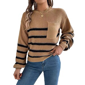 2025秋冬新作 カジュアルな配色ストライプポケット付きランタン袖プルオーバーセーター Amazon越境婦人服